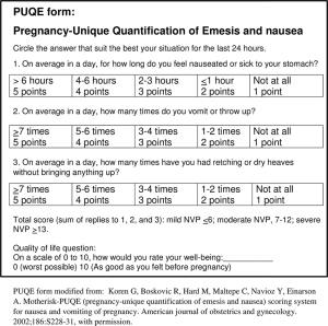The Pregnancy-Unique Quantification of Emesis (or PUQE score for short) is an assessment tool which healthcare professionals could use to help them to determine the severity of your symptoms and where you may be sitting on the pregnancy sickness spectrum. Each question has a score between 1 – 5 depending on your answer, and the total number scored can be used to get a better understanding of where you may be on the pregnancy sickness spectrum.